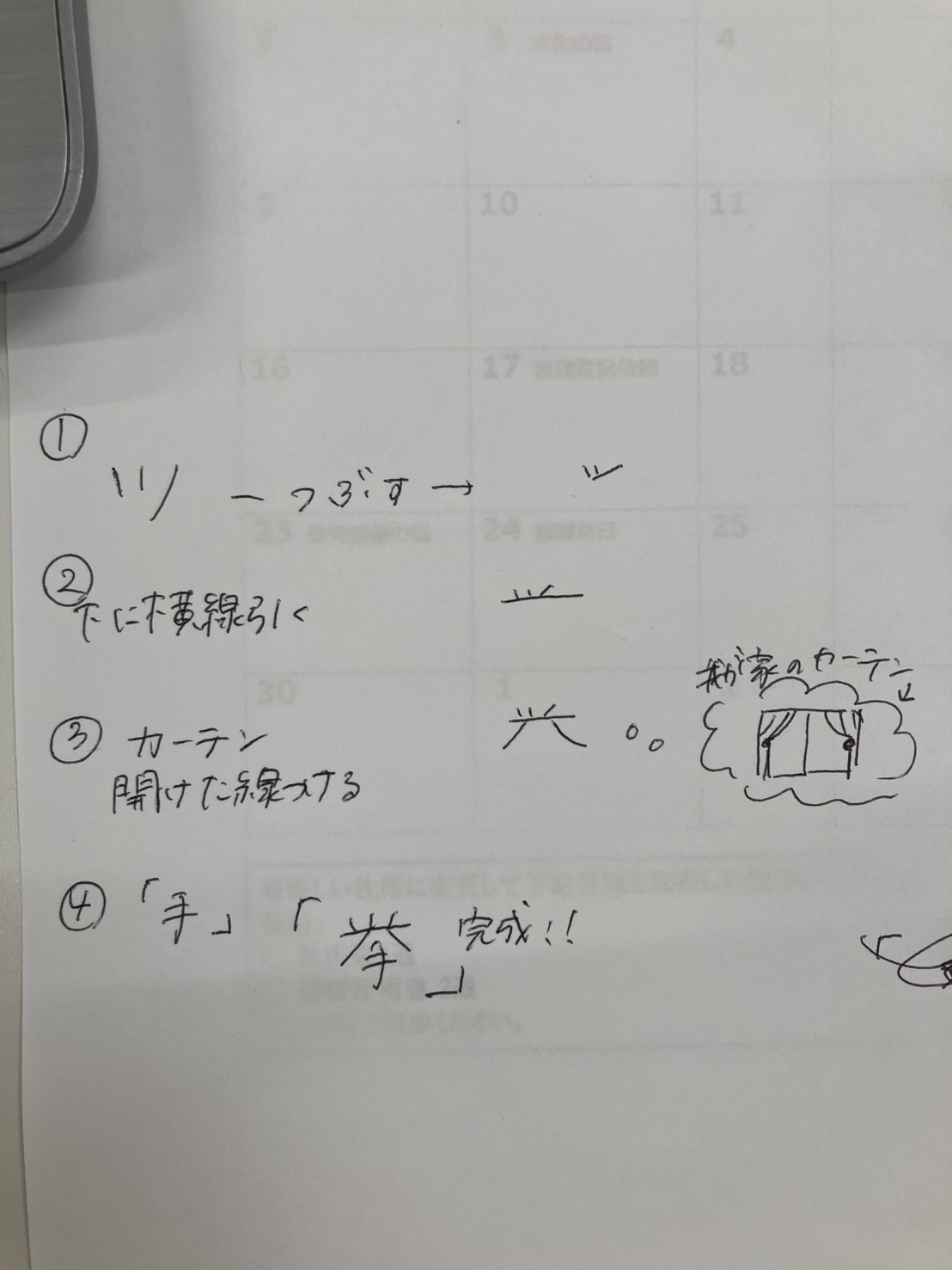 『カタカナのツを潰して下に線引いて、カーテン開けた状態の線を引いて、真ん中に5本指の手』